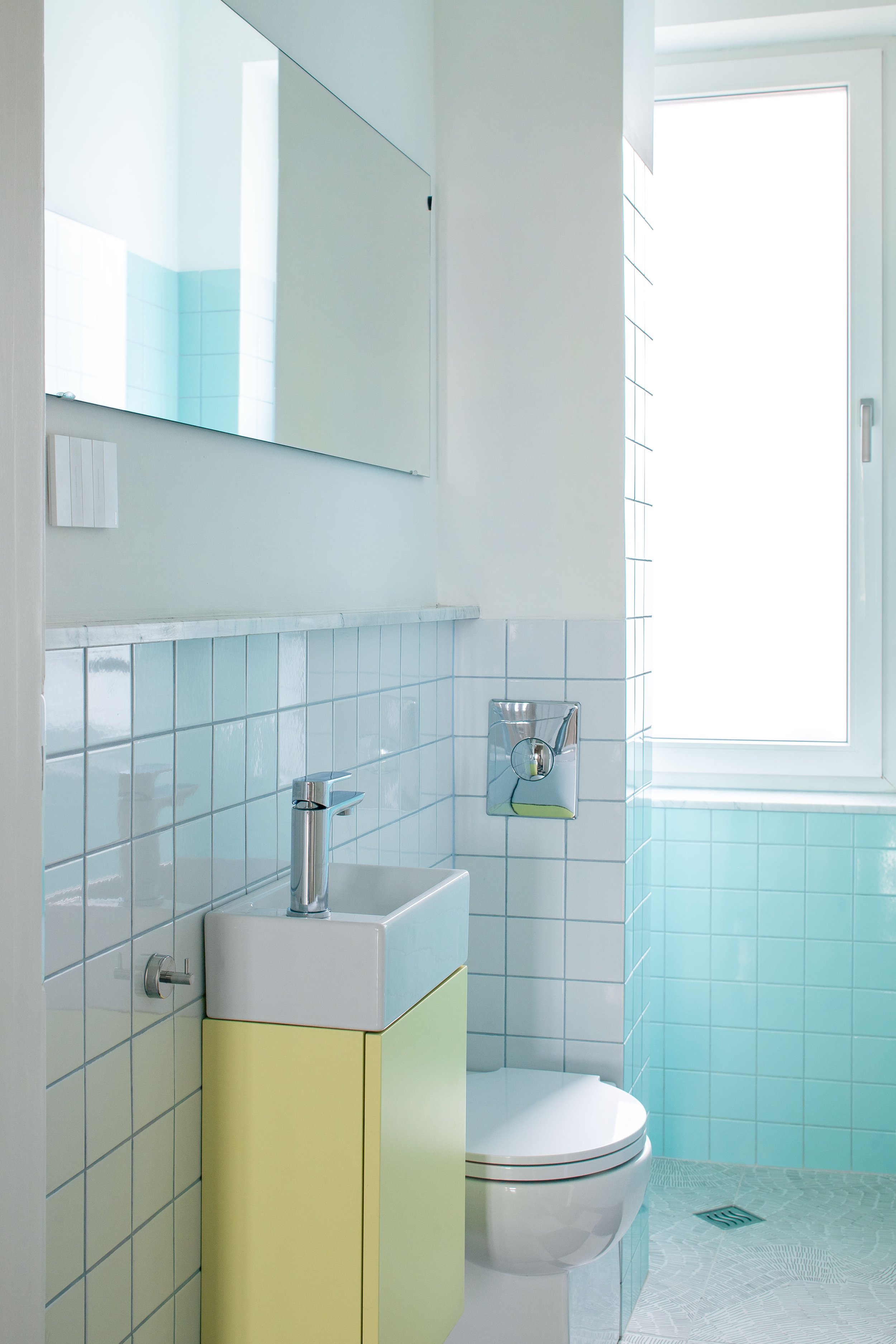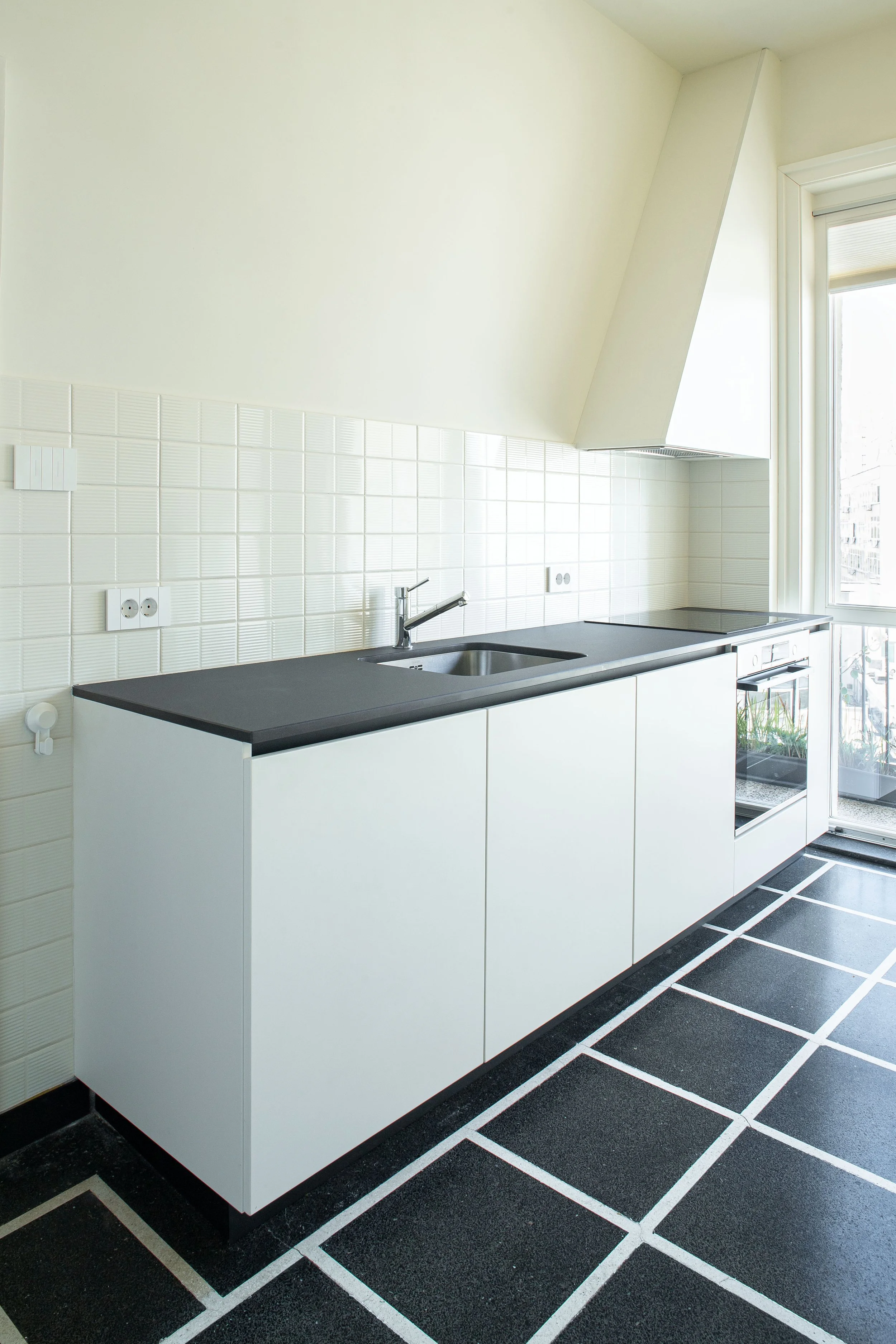 Der Grundriss blieb weitgehend erhalten, während die beiden Bäder und die Küche neu gestaltet wurden – letztere mit großem Respekt vor dem bestehenden Einbauschrank und den originalen Terrazzoböden.