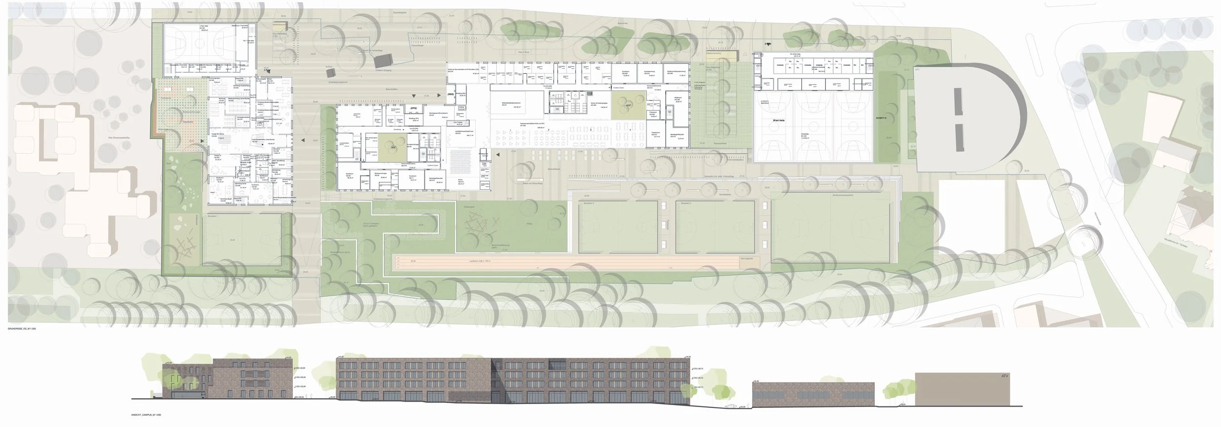 Ein durchgehendes Sportband mit Spielfeldern, Laufbahn und grünen Terrassen verknüpft die Freiräume der Schulen. Unterschiedliche Niveaus und Zonen fördern Bewegung, Begegnung und Austausch.