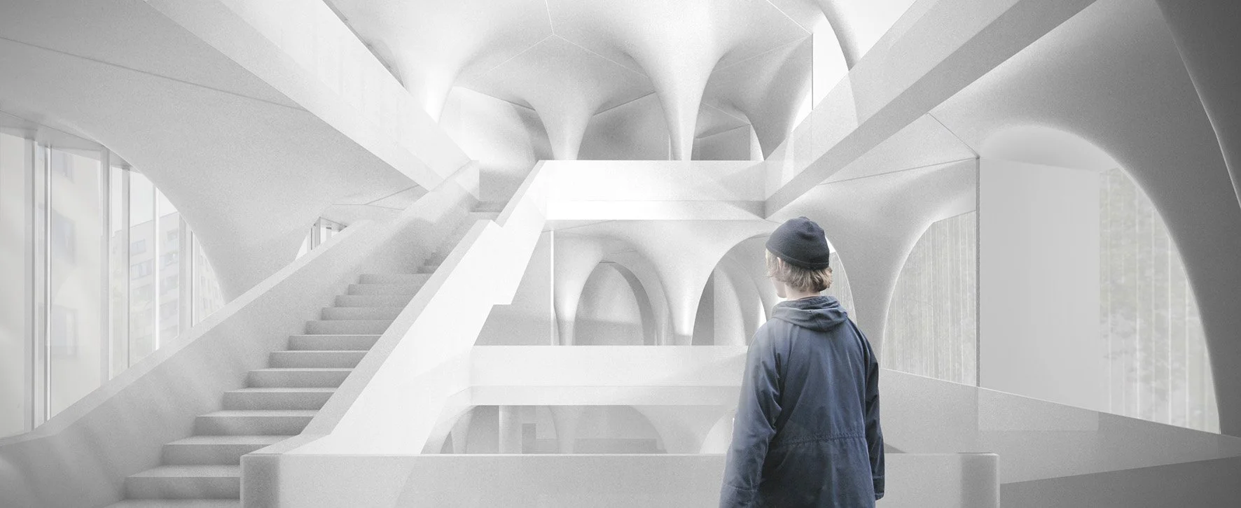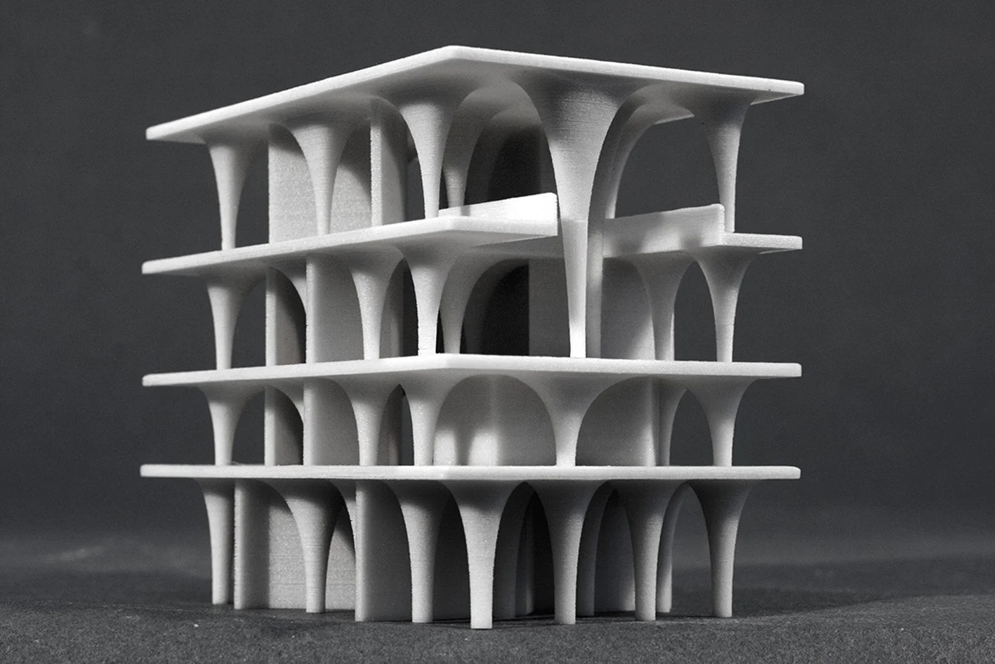Aus der Montage dieser Stützen entwickelt sich ein vielfältiges Gewölbetragwerk: Im Erdgeschoss folgen die Pfeiler einem orthogonalen Raster, in den oberen Geschossen nimmt ihre Anzahl ab und erzeugt unterschiedliche Spannweiten. Gleichzeitig strukturieren die Stützen den Innenraum, indem sie Schienen für mobile Wände aufnehmen und flexible Raumkonfigurationen erlauben. Durch ihre hohe thermische Masse wirken die massiven Elemente als Klimapuffer und verbessern die Energieeffizienz des Gebäudes.